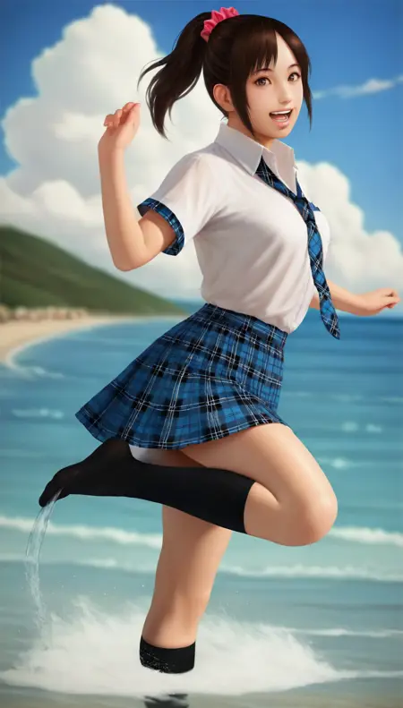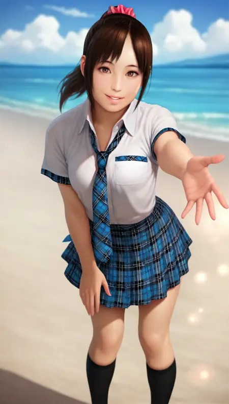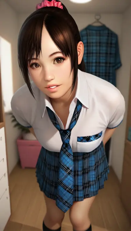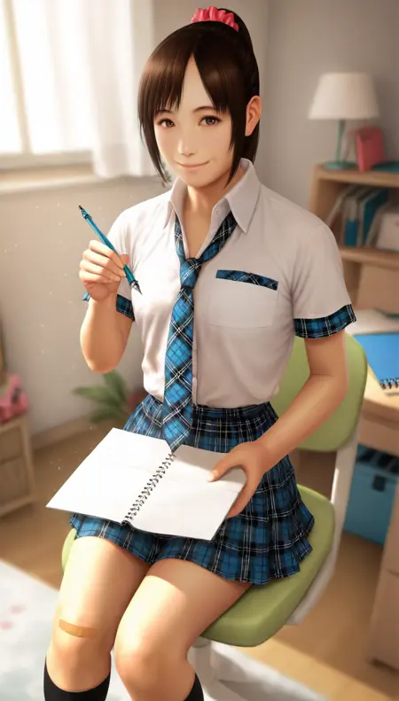 miiyamotohikari, realistic, 1girl, solo, black hair, bangs, pink scrunchie, brown eyes, white collar shirt, blue plaid skirt, blue plaid necktie, red wristband, black kneehighs, bandaid on knee, brown leather shoes,