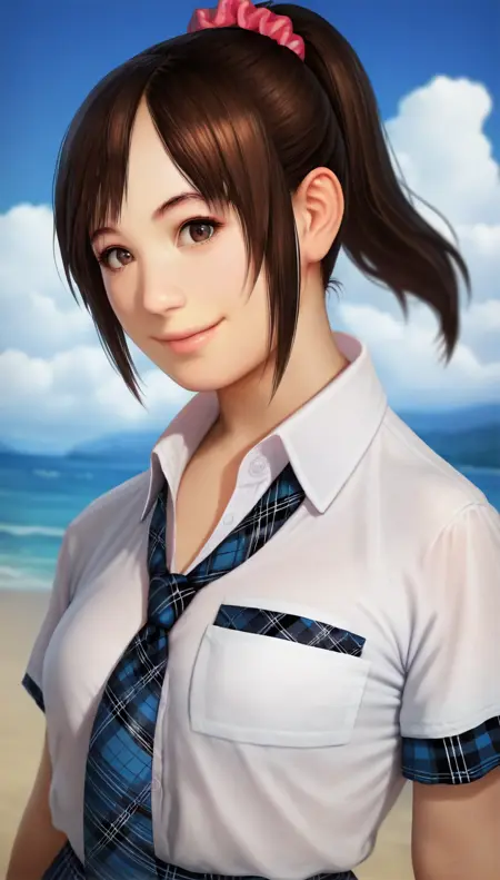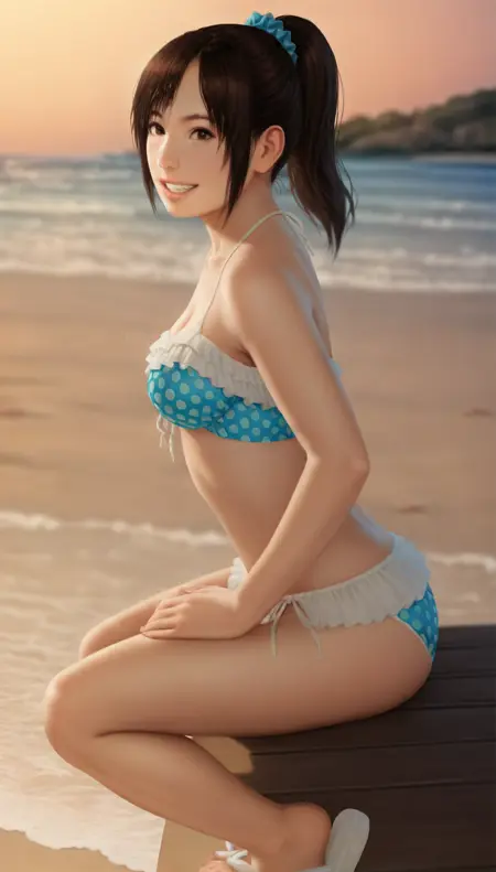 miiyamotohikari, realistic, 1girl, solo, black hair, ponytail, bangs, blue scrunchie, brown eyes, blue bikini with white trim, white ribbon, white flip-flops,