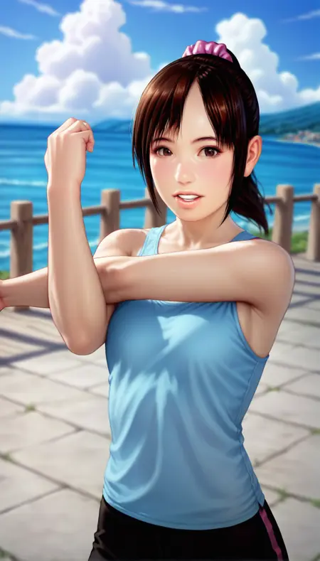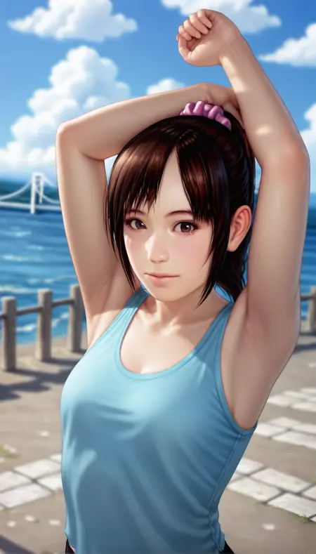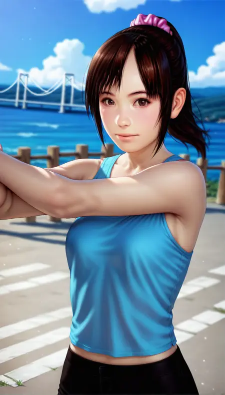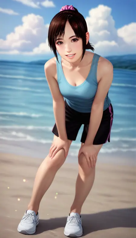 miiyamotohikari, realistic, 1girl, solo, black hair, bangs, ponytail, pink scrunchie, brown eyes, looking at viewer, cyan tank top, black wristband, black shorts, white sport shoes,