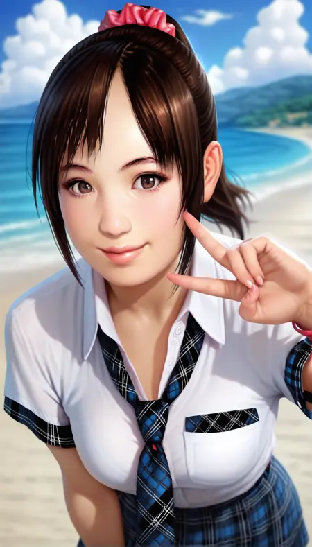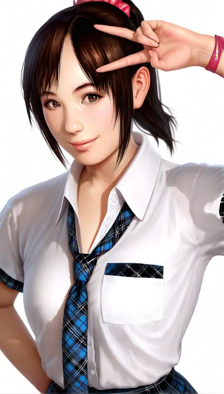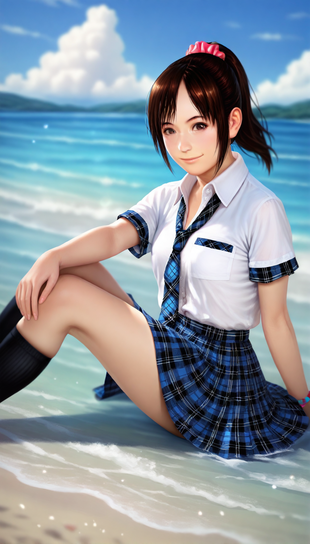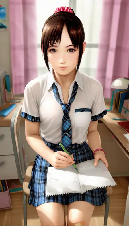 miiyamotohikari, realistic, 1girl, solo, black hair, bangs, pink scrunchie, brown eyes, white collar shirt, blue plaid skirt, blue plaid necktie, red wristband, black kneehighs, bandaid on knee, brown leather shoes,