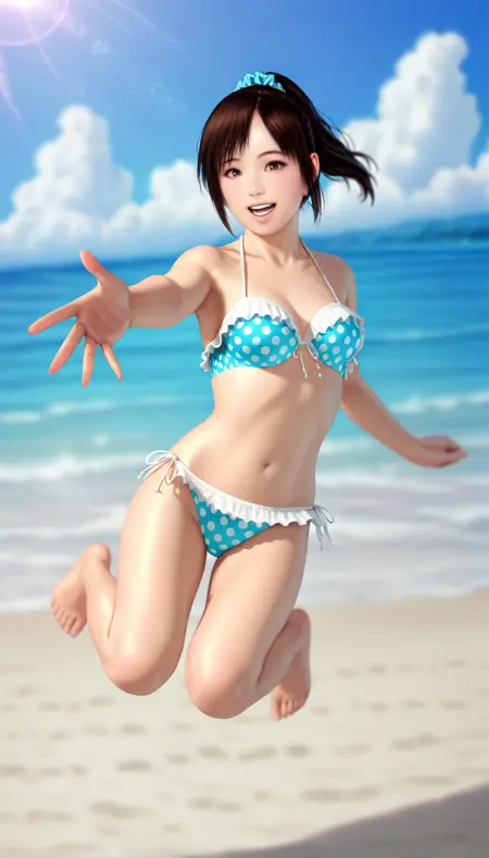 miiyamotohikari, realistic, 1girl, solo, black hair, ponytail, bangs, blue scrunchie, brown eyes, blue bikini with white trim, white ribbon, white flip-flops,