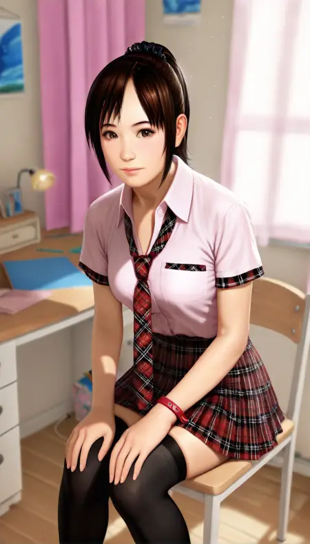 miiyamotohikari, realistic, 1girl, solo, black hair, bangs, black scrunchie, brown eyes, pink collar shirt, red plaid skirt, red plaid necktie, red wristband, black over the knee highs, brown leather shoes,