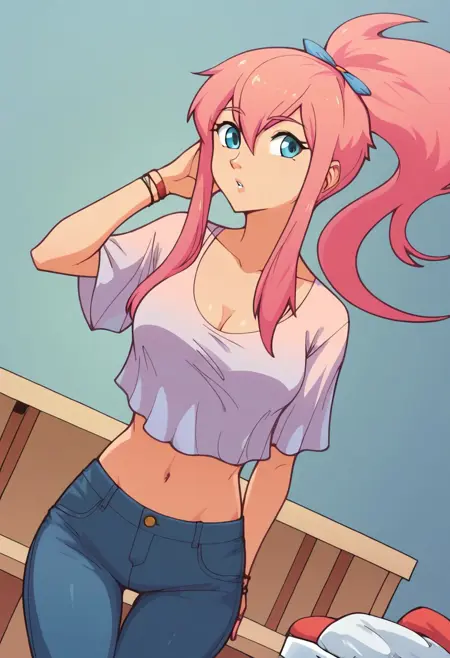 Sunny: 1girl,solo,sunny,pink hair,long hair,ponytail,sidelocks,medium breasts,crop top,navel,midriff,cleavage,cropped shirt,shirt,crop top,jeans,denim,sneakers,red footwear
