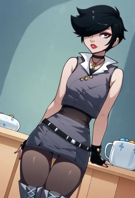 Mari: 1girl,mari,black hair,short hair,hair over one eye,pantyhose,makeup,lipstick,eyeshadow,skirt,sleeveless,fingerless gloves,choker,necklace,cross, belt,boots