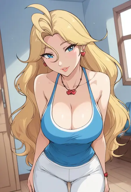 Valentine: 1girl,solo,valentine,blonde hair,long hair,blue eyes,large breasts,blue tank top,bare shoulders,cleavage,white pants,jewelry,heart earrings,heart necklace,blue sandals