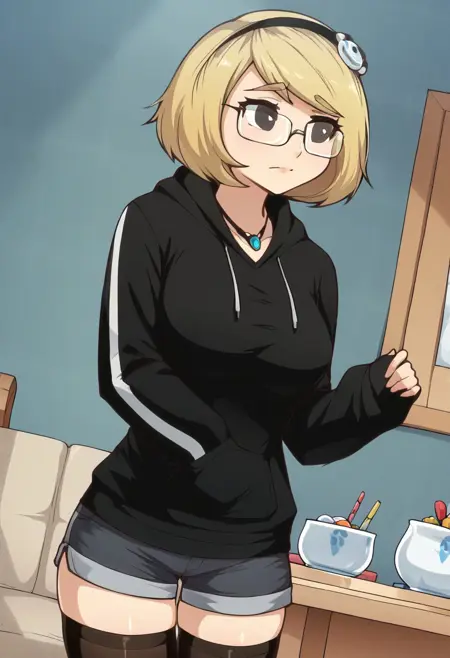 Fiona: 1girl,fiona,solo,black eyes,blonde hair,short hair,swept bangs,large breasts,glasses,semi-rimless eyewear,black-framed eyewear,hood,black hoodie,long sleeves,sleeves past wrists,shorts,thighhighs,zettai ryouiki,jewelry,necklace,hair ornament,black hairband,brown footwear