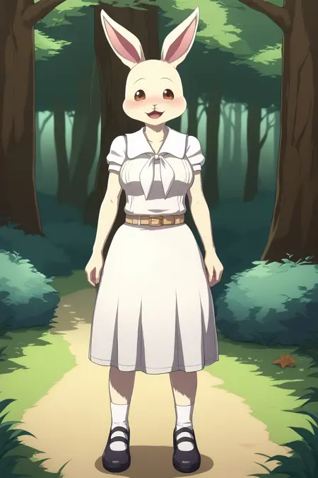 ➜ HaruBPXL, 人形兽人, 兽人女性, 全身毛发, 白色毛发, 棕色巩膜, 棕色眼睛, 动物耳朵, 兔子耳朵, 中等胸部, 白色连衣裙, 白色围巾, 短袖, 腰带, 白色裙子, 白色袜子, 黑色鞋子