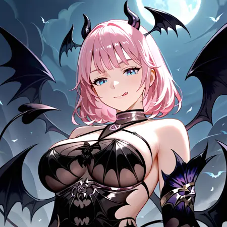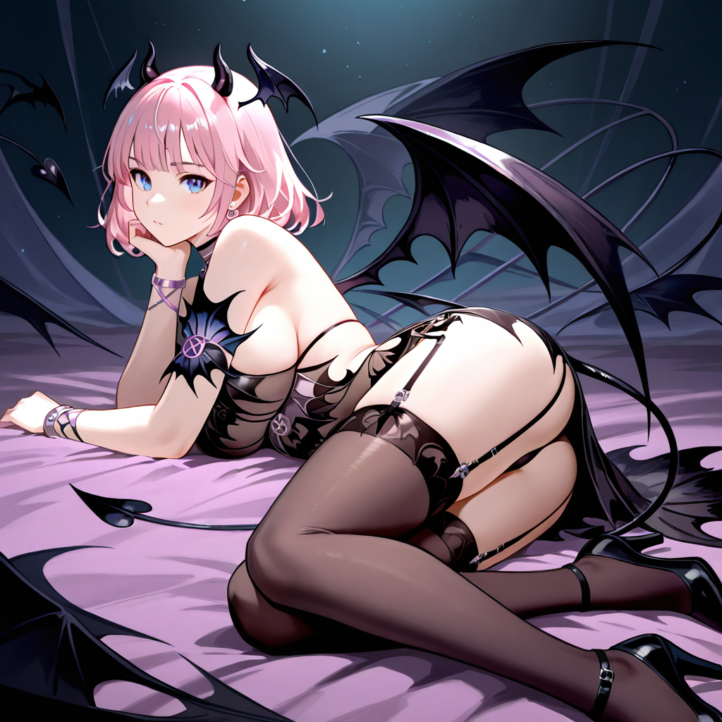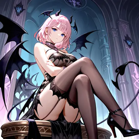Vindictus_Selren, 1girl, solo, pink hair, short hair, large breasts, blue eyes, wings, demon wings, horns, head wings, demon tail, bare shoulders, jewelry, dress, garter straps, thighhighs, high heels