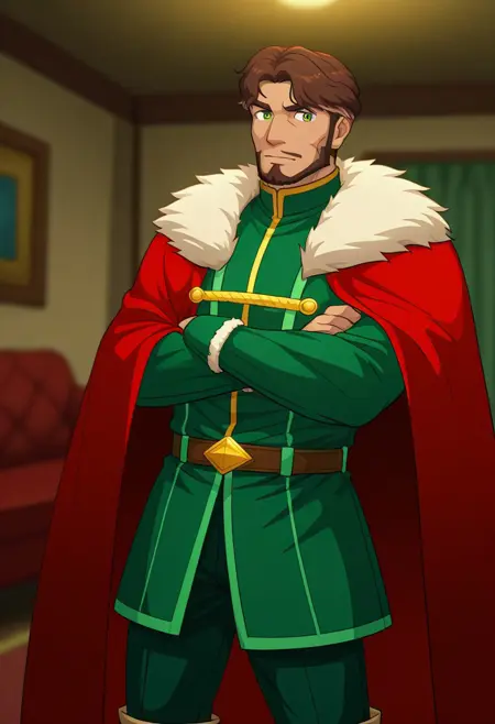 Leo (The male): 1boy,leog,mature male,green eyes,short hair, brown hair,facial hair,beard,red cape,fur trim,belt,boots,king outfit