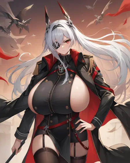 white hair,long hair,eyepatch,black blindfold,red eyes,standing,looking at viewer,gigantic breasts,black coat,military uniform,sideboob,hand on own hip,serious,black thighhighs,