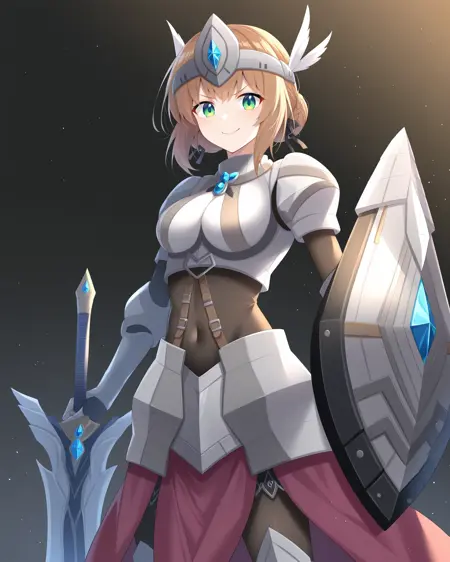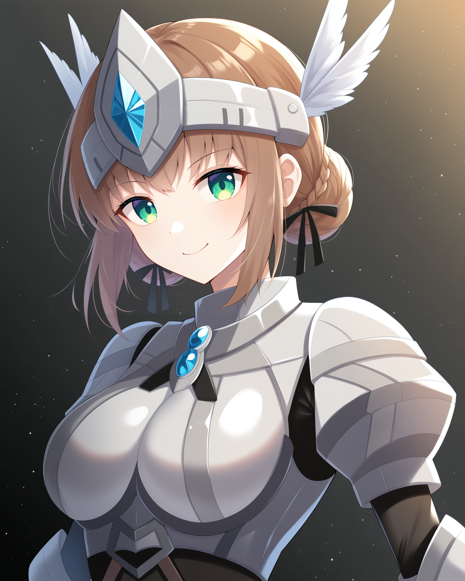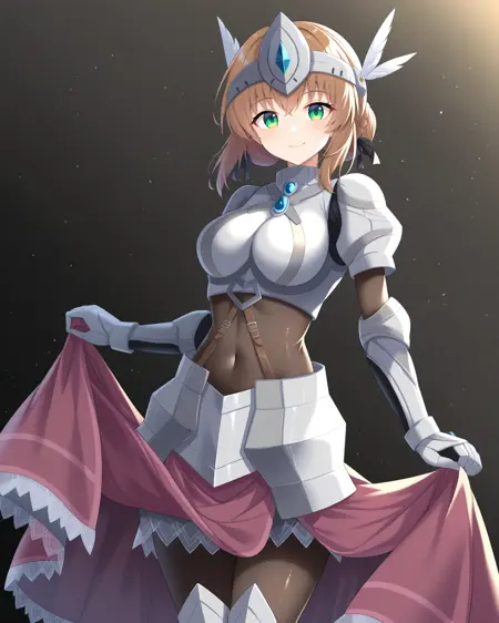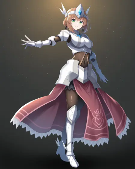 <lora:DuvalieArmor_Illustrious:1>, Duvalie, 녹색 눈, 갈색 머리카락, 머리 띠, 땋은 고기, 머리 뭉치, 중간 크기의 가슴, 날개 장식, 투명 시야, 갑옷, 갑옷 드레스, 검은 바디슈트, 팬티후스, 갑옷 부츠, 정강이 보호대, 치마,
