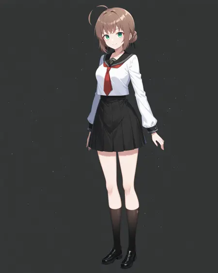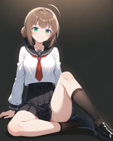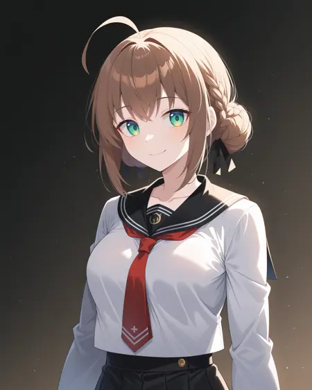 <lora:DuvalieMagical_Illustrious:1>, Duvalie, 绿眼, 棕发, 黑色发带, 编发发髻, 发髻, 天线发, 中等胸部, 学院制服, 红色领结, 白色衬衫, 黑色裙子, 黑色袜子, 黑色乐福鞋,