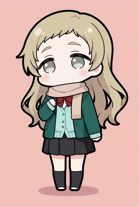 以下のプロンプトで彼女の制服を生成できます:school uniform, green jacket, red bowtie, black skirt, cardigan