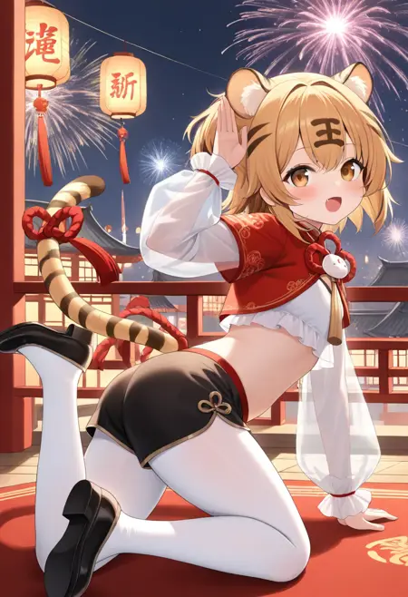 hupen,ahoge,动物耳绒毛,动物纹,金发,棕眼,虎牙,头发位于眼睛间,短发,小胸部,条纹发,条纹尾巴,虎耳,虎女,虎纹,虎尾,smallbrest