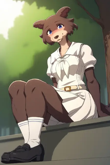 ➜ JunoBPXL, juno_\(beastars\),, アンスロ ファリー, ファリー女性, 体毛, 茶色の毛, 青い目, 動物の耳, オオカミの耳, 中程度の胸, オオカミの尾, 学校の制服, 白いドレス, 白いネッカチーフ, (短袖), ベルト, 白いスカート, 白い靴下, 黒い靴