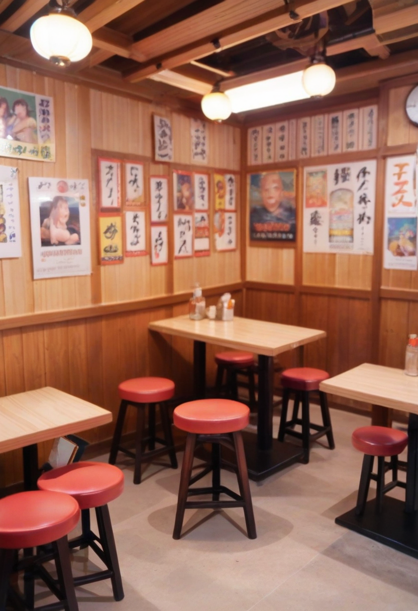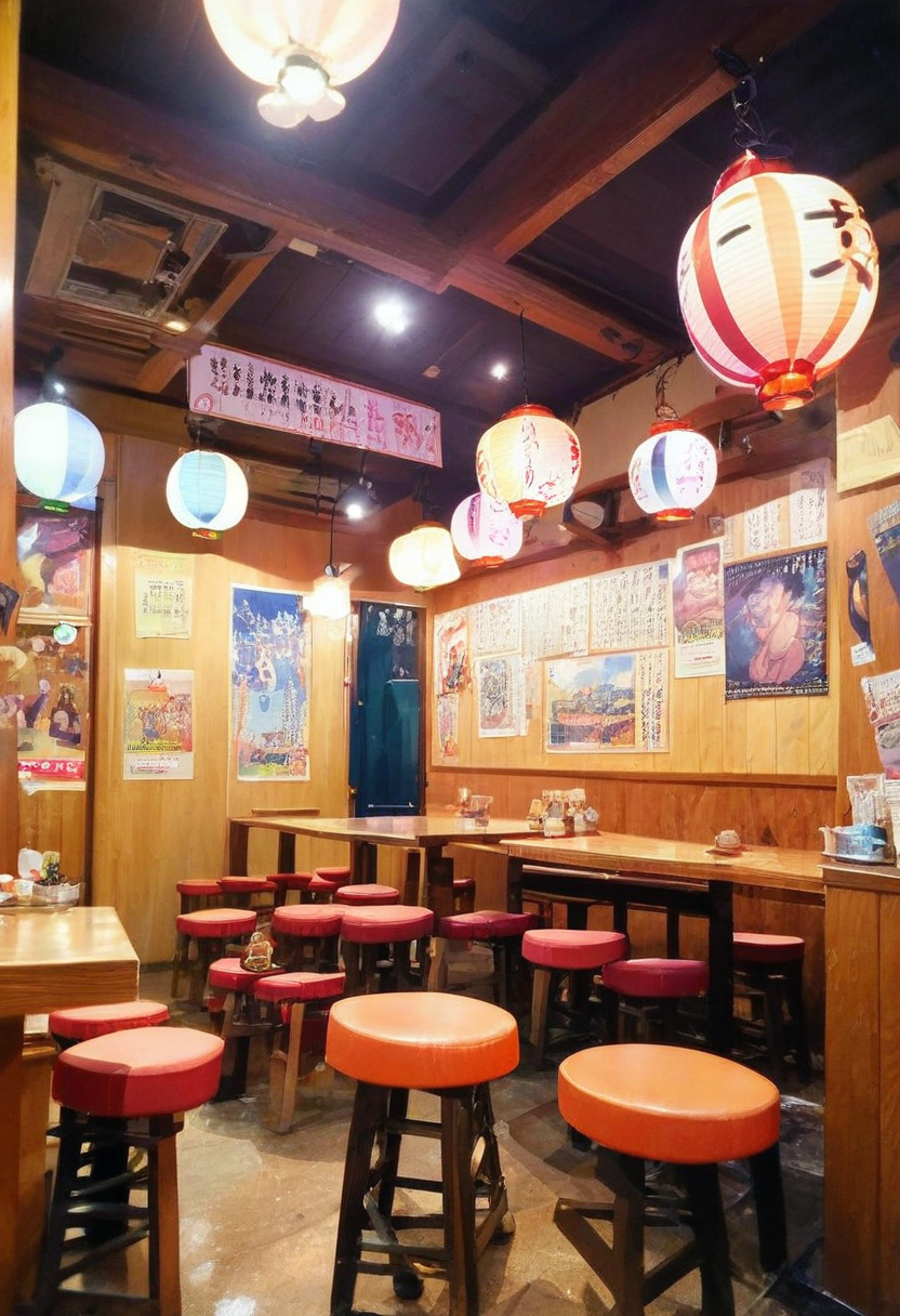 sakaba, scenery, indoors, table, bar (place), chair, ceiling light, light, stool, lamp, japanese architecture
