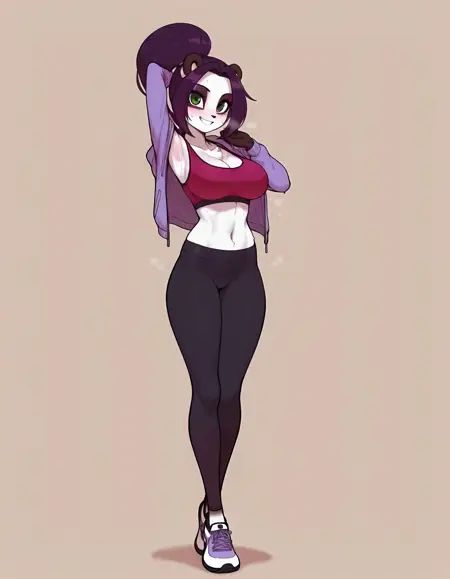green eyes, black hair, tied hair, parted bangs, white fur, eyeshadow, colored skin, purple hair, black fur