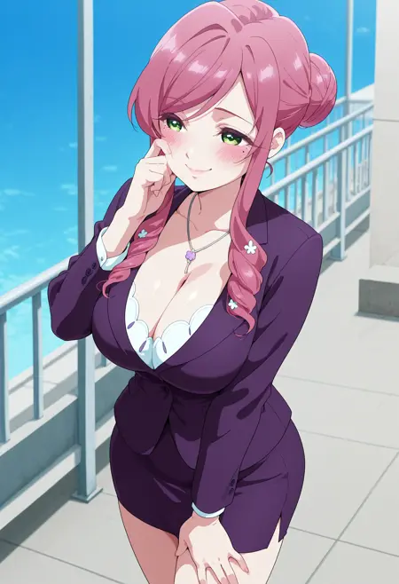 スーツ: 紫のビジネススーツ, 紫のスカート, ハイヒール, 髪を結んだスタイル, ネックレス,
