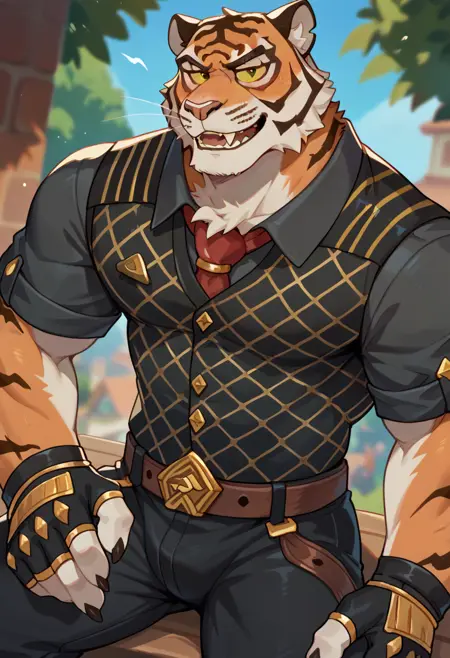 score_9, score_8_up, score_7_up, hi res, high quality, oscar, fortnite, furry, tiger boy, bara, 1boy, solo, yellow sclera, black pupil, pants, belt, fingerless gloves, ...your tags...