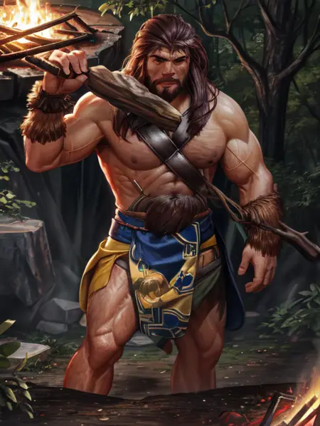 可能有帮助的额外词:黄色衣物、棕色衣物、腰布、动物花纹、户外、破烂衣物