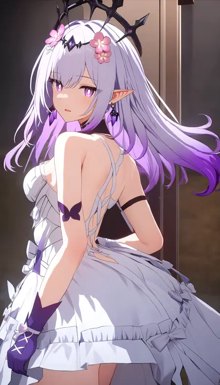 (best quality,8K, masterpiece:1.3), 1girl, Castorice, solo, teen, purple eyes, long hair, purple hair, ( pointy ears, elf:0.6),( multicolored hair, gradient hair:0.5), dress, detached collar, flower, bright pupils, bangs, hair ornament, hair flower, pink flower, purple flower, white dress, purple gloves, ( single glove:1.3), long gloves, earrings, hair ornament, black crown, flower, ring, jewelry, bare shoulders, small breasts, upper body,looking at viewer