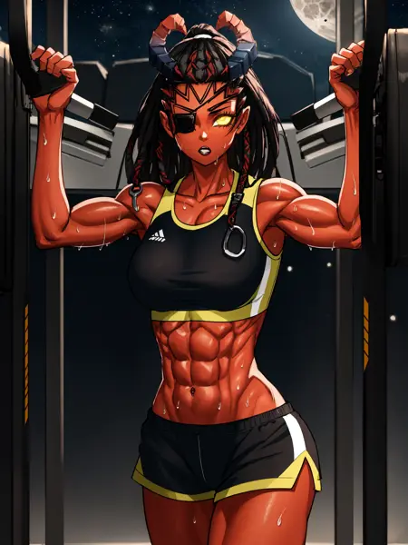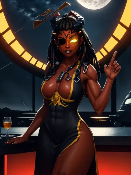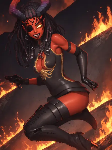彼女の主な衣装には「kisb, leotard, thigh boots, eyepatch」を使用し、この設定をプロンプトする際は重みを1.0に保ってください。