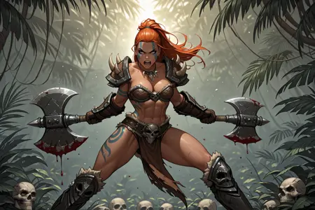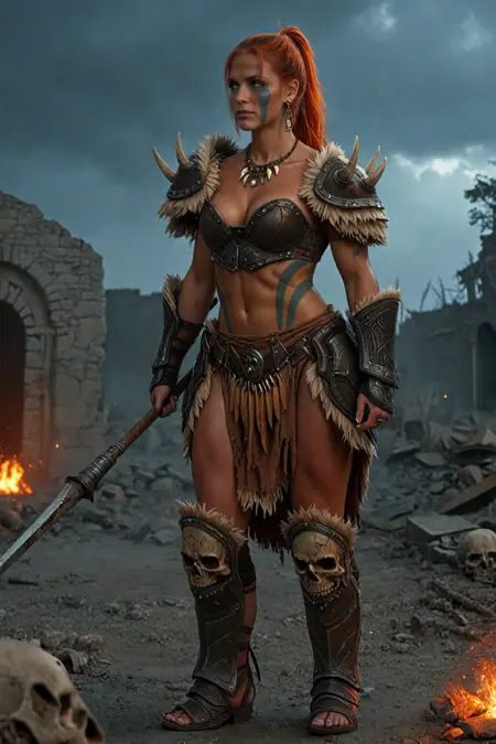 Trigger : 1girl, long hair, tattoo, armor, earrings, shoulder armor, pauldrons, ponytail, muscular, abs, midriff, bikini armor, tribal, necklace, facepaint, cleavage, spikes, toned, gloves, gauntlets, loincloth, skull, fur trim, facial tattoo, greaves, vembraces