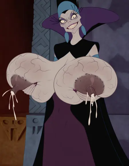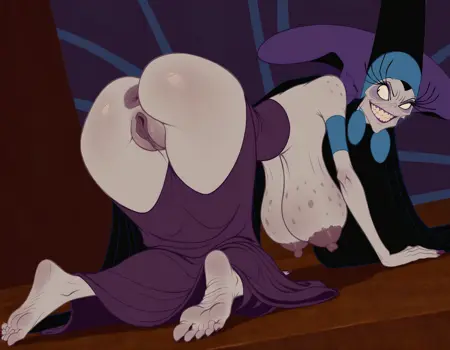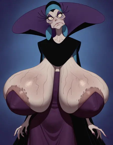 Yzma,skinny,elderly,woman,dark purple dress,black hair,wrinkled pale skin