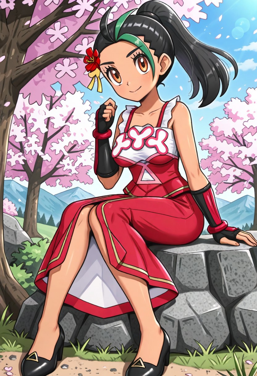 发饰、头发花朵、红花、红裙、无袖连衣裙、臂环、长裙、锁骨、黑色手套、鞋子、黑色鞋履
