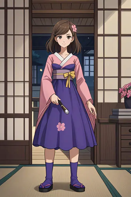 furiblossom, (long_hair:1.4), brown_hair, hair_flower, (dark-skinned_female:1.3), brown_eyes, japanese_clothes, kimono, pink_kimono, purple_skirt, sash, wide_sleevees, kneehighs, purple_socks, sandals,