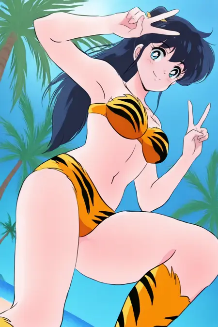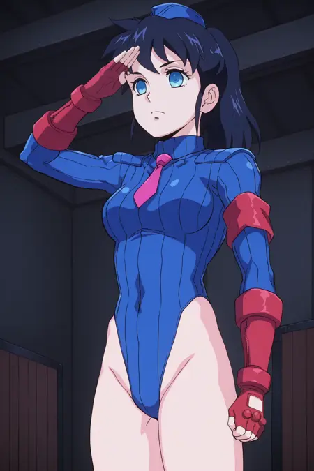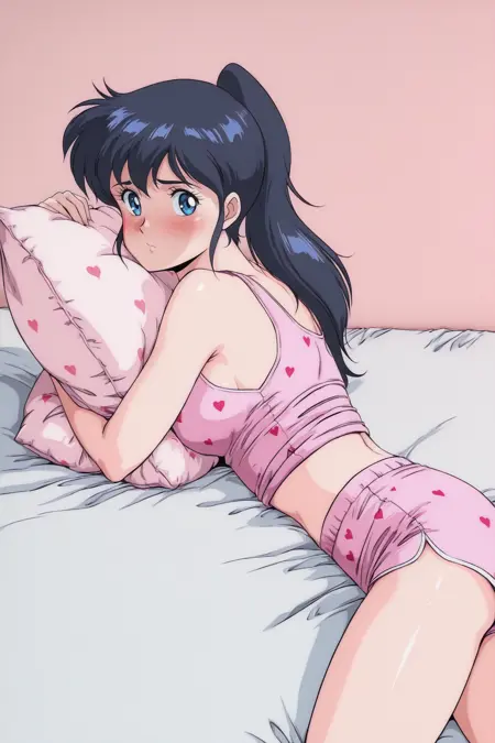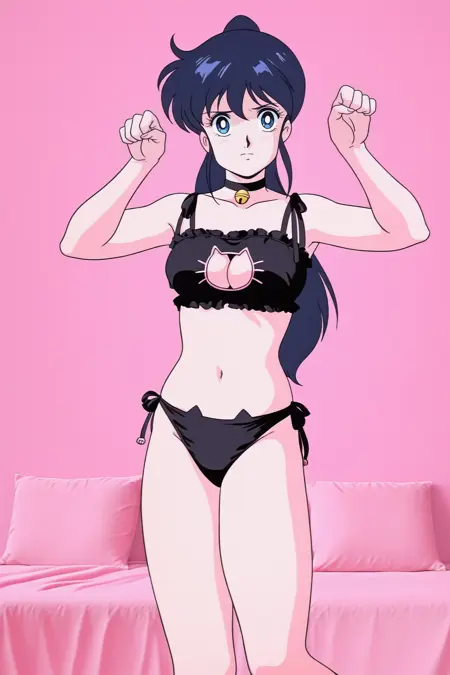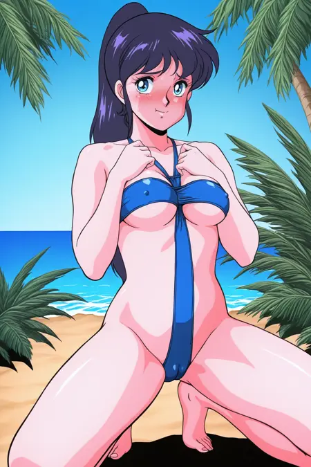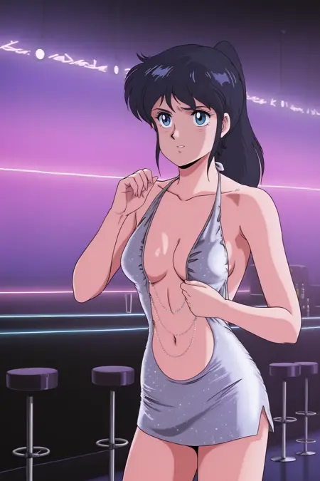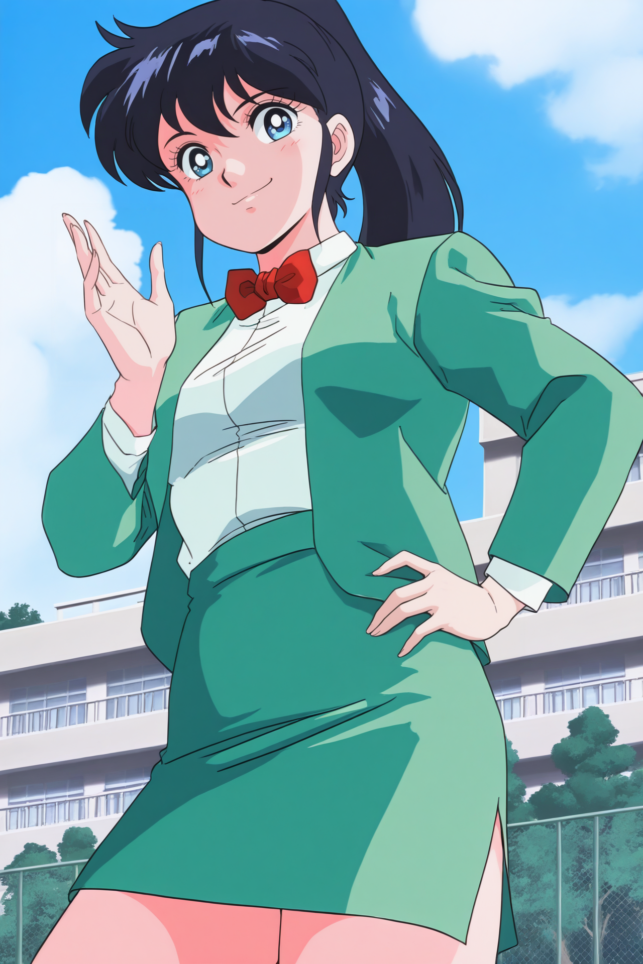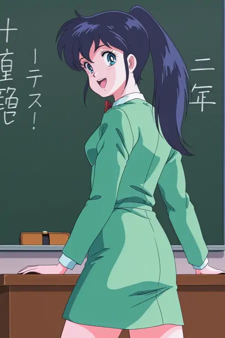 メインプロンプト: Hinako Shiratori、ポニーテール、青い目、黒髪、長い髪、中程度の胸、1980年代(スタイル)
