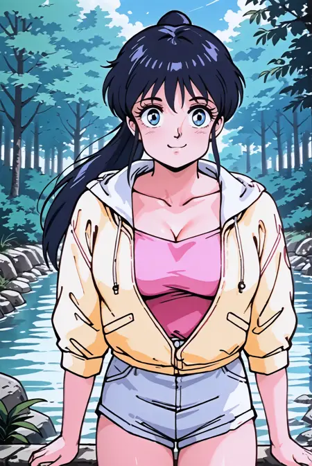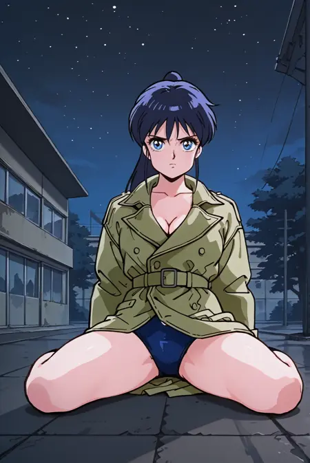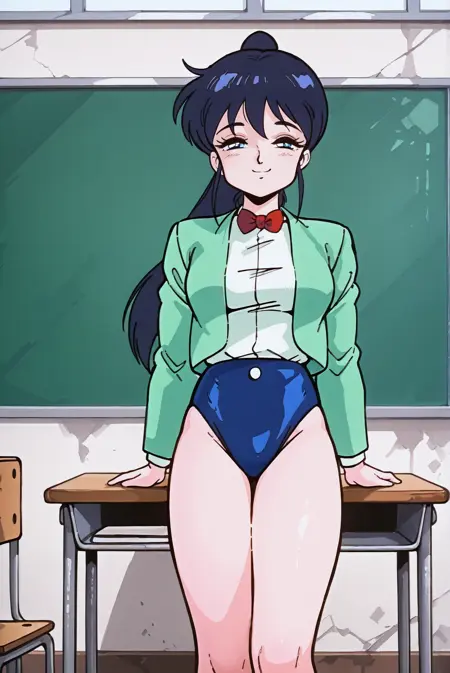 주요 프롬프트: 히나코 시라토리, 폰테일, 파란 눈, 검은 머리, 긴 머리, 중간 사이즈 가슴, 1980년대 \(스타일\)