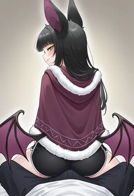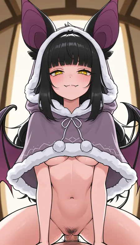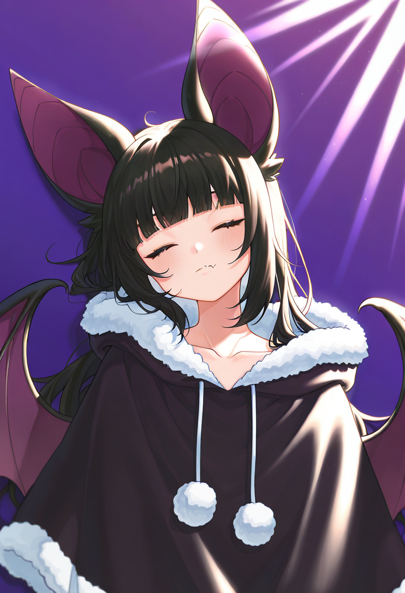MorikoKyoho, 1girl, solo, long hair, yellow eyes, blush, black hair, animal ears, bat ears, collarbone, wings, bat wings, purple wings, fangs, hood, hood down, hoodie, blunt bangs, fur trim, capelet, pom pom (clothes), drawstring, poncho, bat girl,