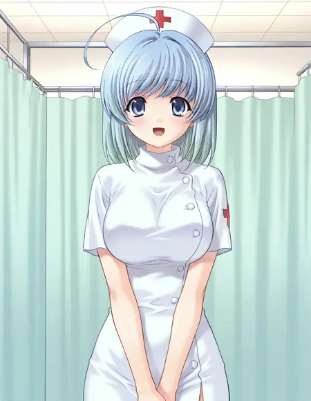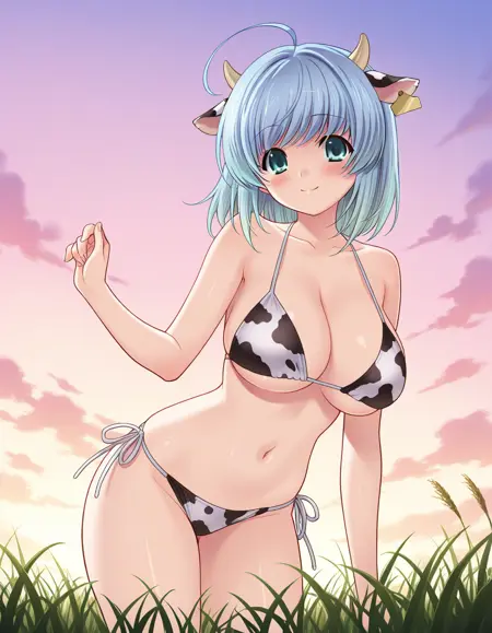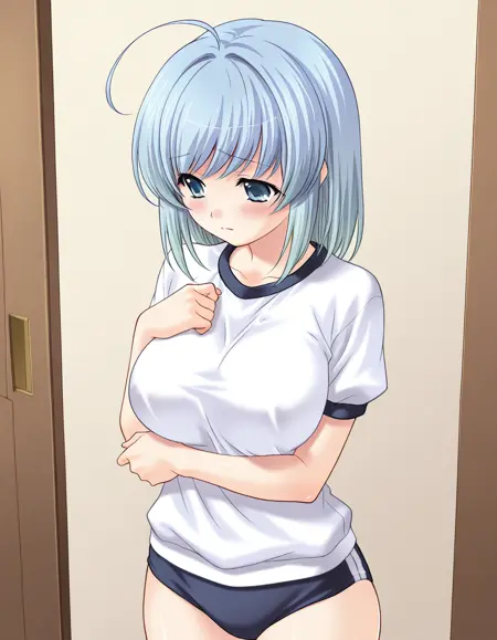 Muriel, 1girl,solo, blue hair, ahoge, medium hair, light blue eyes, large breasts,