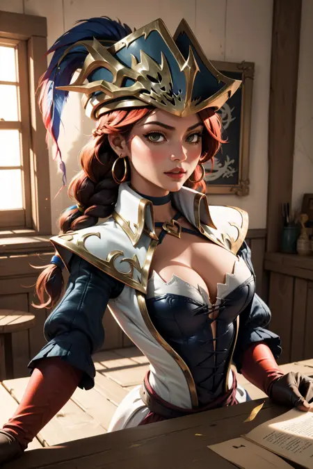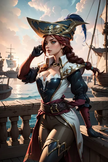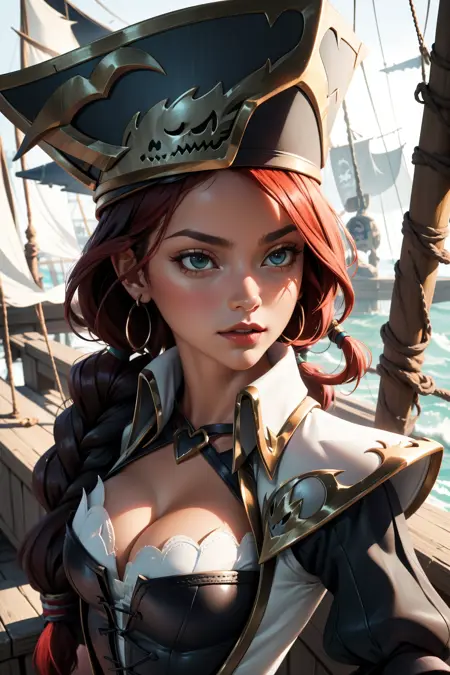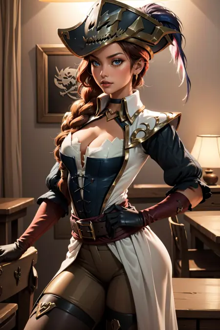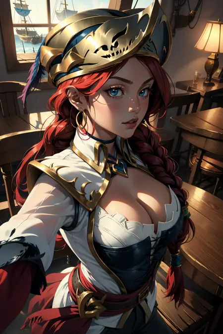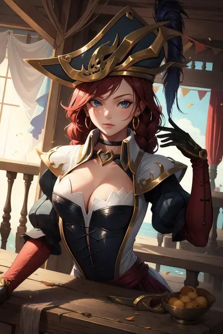 태그: 캐피틴 포춘, 1소녀, 가슴 노출, 해적 모자, 땋은 머리, 풍성한 소매, 팔꿈치 장갑, 가슴 노출