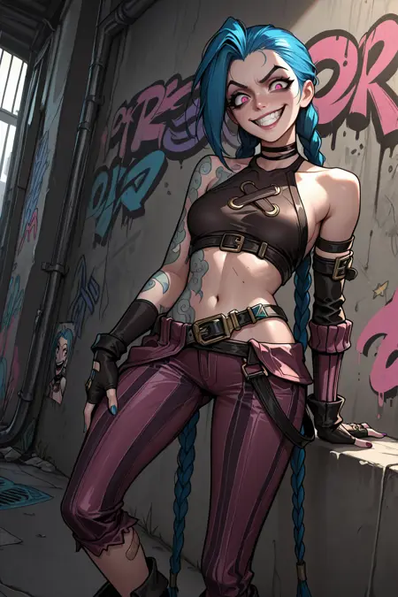 트리거 Lol: JnxPwdr, 긴 머리카락, 두 개의 땋은 머리카락, 문신, 어깨 드러냄, 목걸이, 비키니, 탄약대, 허리선 노출, 손가락 없음 장갑, 한쪽 팔꿈치 장갑, 비대칭 장갑, 총알 허리띠, 줄무늬 반바지, 한쪽 허벅지 긴 양말, 패션 네트 양말, 허벅지 스트랩, 다리에 붕대, 총알, 그래피티