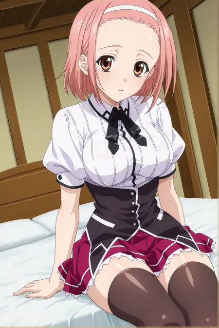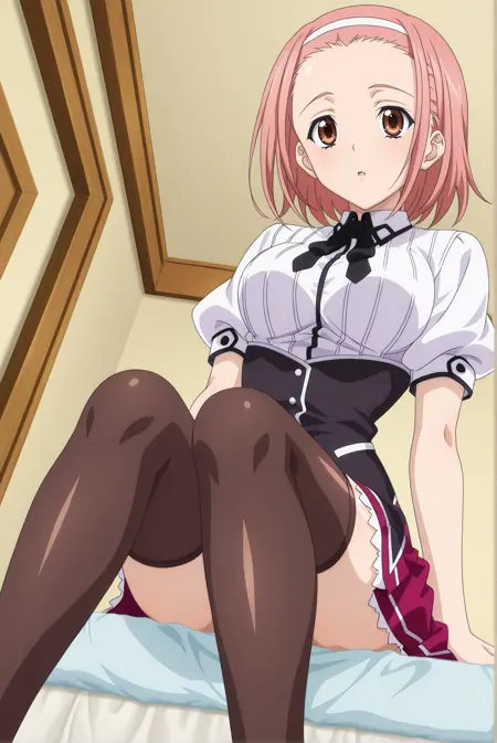 katase-dxd, 1girl, short hair, pink hair, hairband, brown eyes, warm chestnut brown eyes, shirt, skirt, black, black thighhighs, zettai ryouiki, puffy sleeves, dxd-uniform