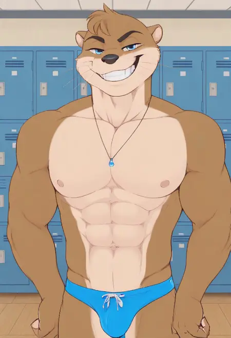 强化提示:“水獭男孩,毛茸茸的,尾巴,蓝眼睛,肌肉发达,男性化,阳刚,宽大的胸肌”