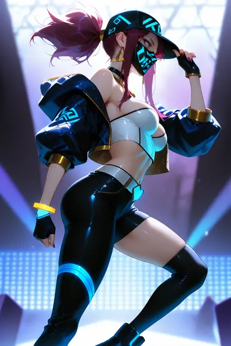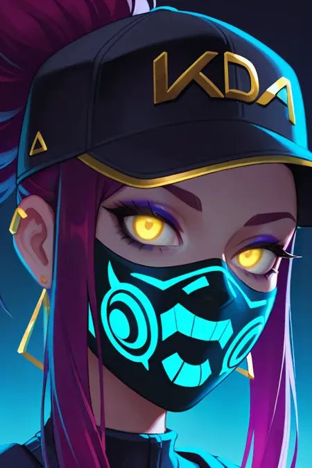 触发词“KDA”:KDA, akli, 黄眼睛, 长发, 紫色头发, 刘海, 马尾辫, 棒球帽, 乳沟, 耳环, 领子, 项链, 连帽外套, 露肩, 无指手套, 手链, 无肩带, 白色束胸衣, 露腹, 腰带, 单条黑色长裤腿, 单条黑色过膝袜, 不对称腿部穿搭, 单条裸露大腿, 单条膝上袜, 运动鞋, 妆容, 指甲油, 戴着霓虹发光图案面具