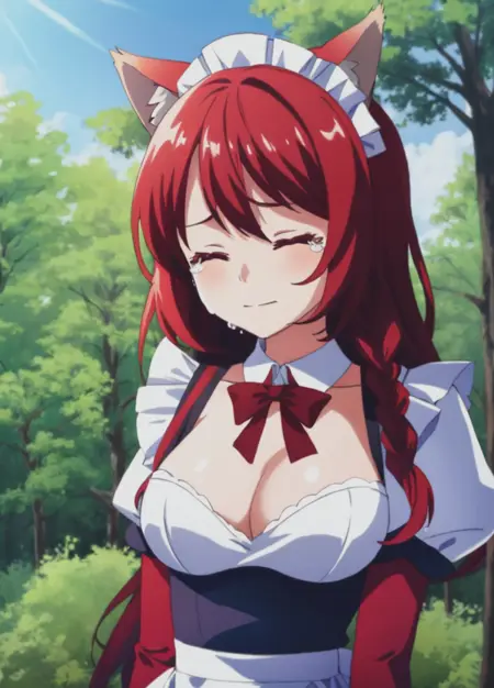 メイド: フレイ、1人 girl、動物の耳、胸、赤い目、赤い髪、一人、長い髪、メイドの頭飾り、胸元、大きな胸、尾、ネクタイ、観察者を見つめる、手を腰に当てている、短い袖、メイド