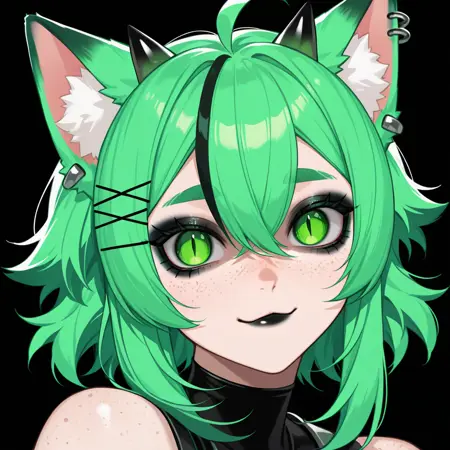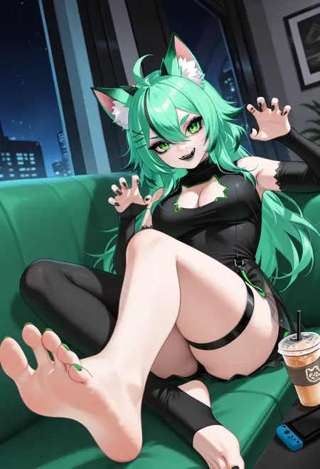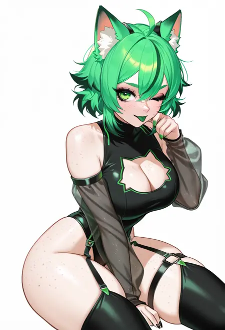 | 训练词汇 | MomoMischief 已复制! MomoMischief, 1girl, solo, cat girl, breasts, large breasts, cleavage, freckles, skindentation, green hair, black hair, streaked hair, medium hair, hair between eyes, ahoge, hairclip, hair ornament, green eyes, slit pupils, animal ears, cat ears, animal ear fluff, tail, cat tail, green tail, tail ornament, leotard, black leotard, cleavage cutout, clothing cutout, thighhighs, single thighhigh, black thighhighs, see-through, see-through sleeves, toeless legwear, stirrup legwear, thigh strap, anklet, bracelet, spiked bracelet, detached sleeves, puffy sleeves, puffy long sleeves, long sleeves, bridal gauntlets, barefoot, bare shoulders, jewelry, piercing, ear piercing, mascara, nail polish, green nails, toenails, toenail polish, 已复制! |