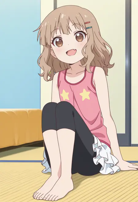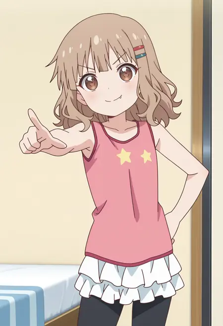 - oosaku, light brown hair, medium hair, brown eyes, hairclip, fang, pink tank top, star print, sleeveless, white skirt, frilled skirt, black leggings,