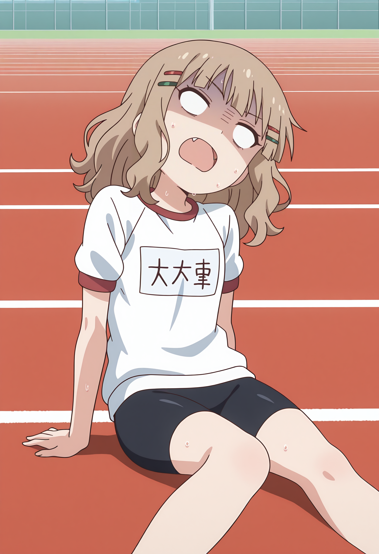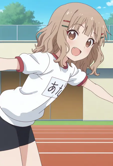 - oosaku, light brown hair, medium hair, brown eyes, hairclip, fang, gym uniform, gym shirt, name tag, bike shorts, sneakers,