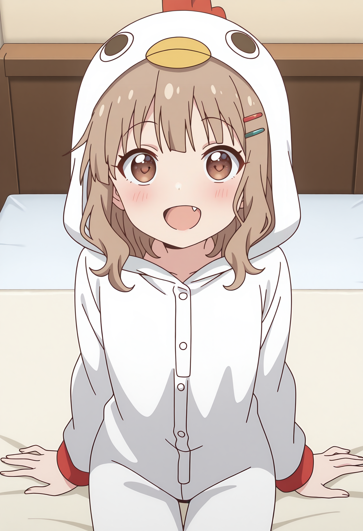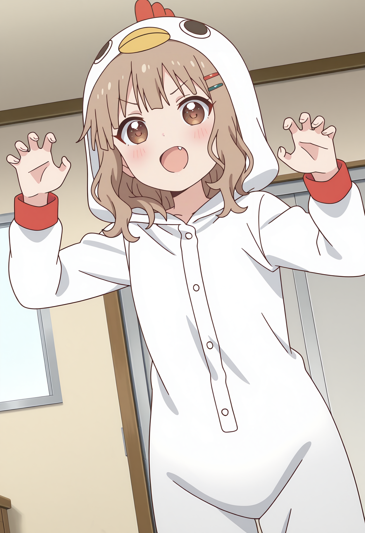 - oosaku, light brown hair, medium hair, brown eyes, hairclip, fang, animal costume, white pajamas,