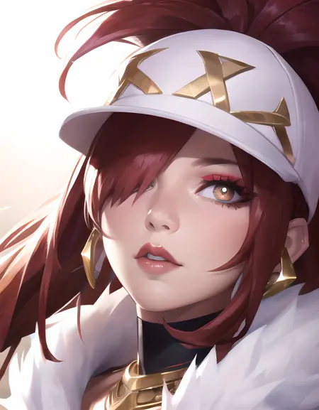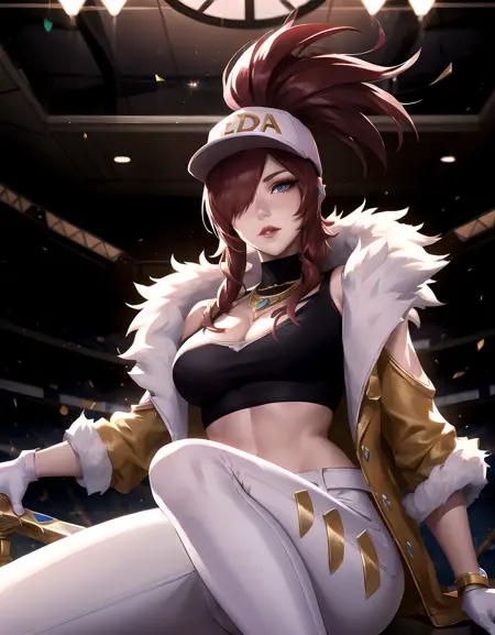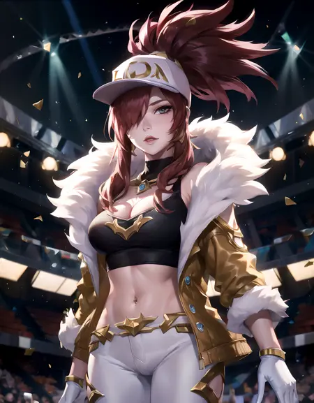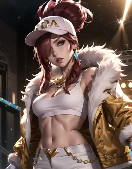 Example: lora:Akali\_KDA\_Prestige:0.7, Akali kda prestige, 1girl, solo, long hair, jewelry, medium breasts, ponytail, red hair, necklace, hair over one eye, lips, makeup, white headwear, crop black top, fur trim, jacket, white gloves, white tight pants, k/da (league of legends), standing