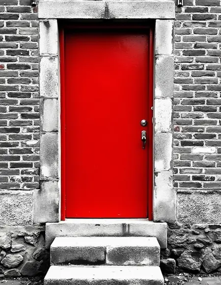 diclrpp, 明るい赤いドアが古く風雨に晒されたレンガの壁に際立っている。塗装は鮮やかで新しく塗られたようだ。画像の他の部分は黒白で、レンガの褪せた質感やドアに続く摩耗した石段が描かれている。