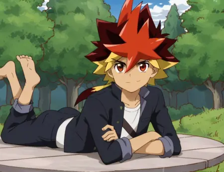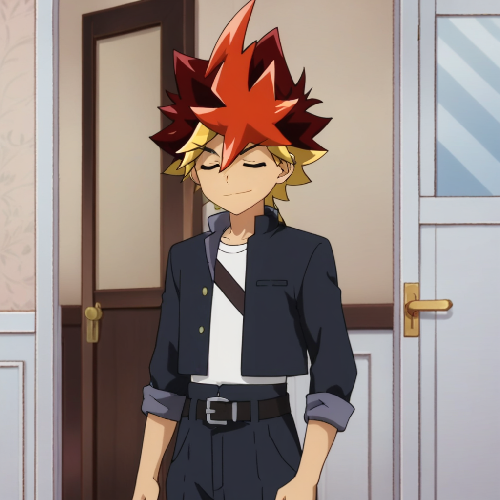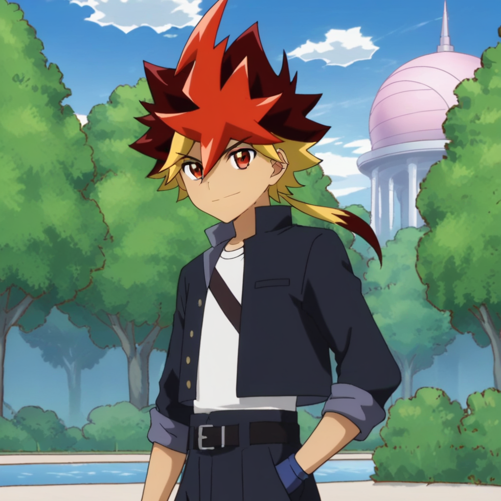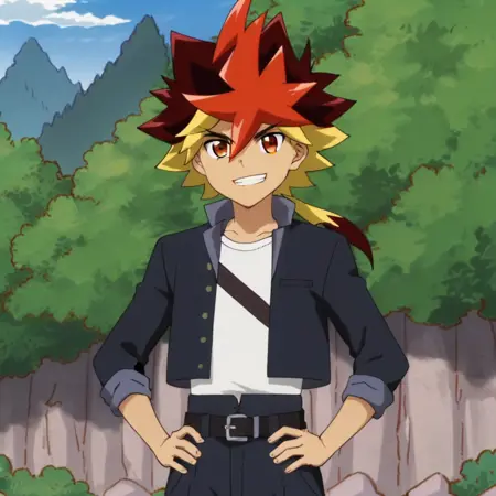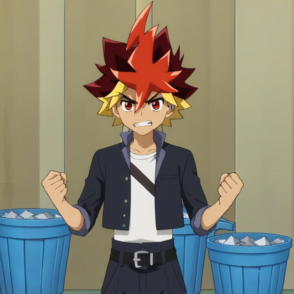 プロンプト:男性、複色の髪、三色の髪、金髪、濃い赤髪、薄い赤髪、とがった髪、ポニーテール、赤い目、黒いジャケット、袖をまくった、白いシャツ、左手に青いフィンガーレスグローブ、黒いズボン、黒いベルト、黒いローファー、屋内(寝室/ピンクの壁/ピンクの壁紙)、屋内(郵便室/ゴミ箱)、屋外(公園/水塔)、屋外(森)、屋外(山)