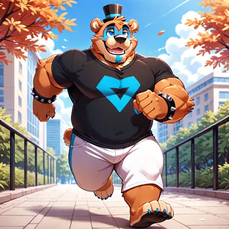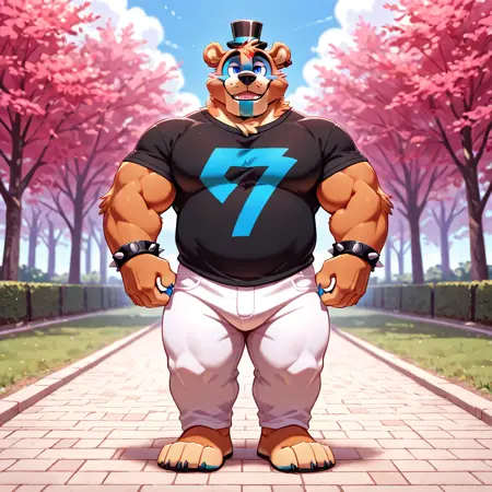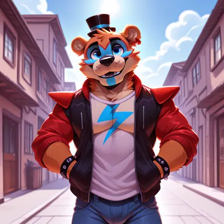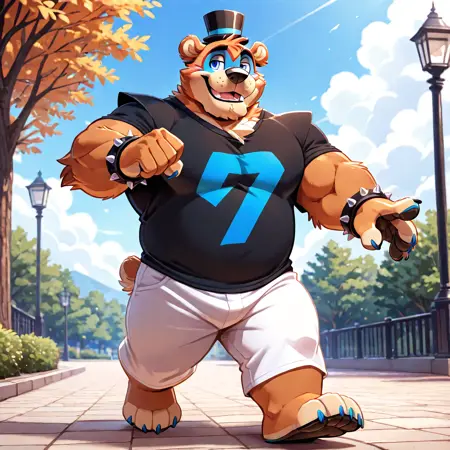 , (bigfreddy), bear ears, solo, (looking at viewer), perfect body, (perfect anatomy), fluffy paws, (fluffy paws), detailed ears, detailed hands, detailed body, perfect body, (detailed hands), zPDXL3, detailed hat, male focus, nice background, (flat chest), fluffy head:0.8, looking at viewer, cute and chubby round belly, black bowtie, cute and chubby body, Negative: score_4, score_5, score_6, brown fur, pdxl, ((text)), watermark (watermark), text, logo, username, fluffy neck, zPDXL2-neg, Unspeakable-Horrors-Composition-SDXL boring_sdxl_v1, five fingers, bad hands, missing fingers, (claws, claws on fingers), broad snout, palm tree, palm tree, green hands, ((green hands)), bad hands, ((bad hands)), bad anatomy, bad body, bad arms, ((bad arms)), bad legs, (five fingers), two fingers, (two fingers), (hands in the frame), nude, shoulders pads, navel, bulge, (bulge), running, crooked canines:0.5, long canines, muscular, (muscular), table, chibi, (chibi), visible robot joints, (visible robot joints), digitigrade, hand in frame, bad-hands-5-SDXL negative_hand-neg-SDXL, bad lighting, (bad lighting), abandoned building, warehouse, (((duplicate))), (bad quality, worst quality), (human), (((watermark))) ((morbid)), ((mutilated)), (bad anatomy), (malformed limbs), ((missing arms)), ((missing legs)), (((extra arms))), (((extra legs))), mutated hands, ((fused fingers)), (too many fingers), mutant, ((out of frame)), ((poorly drawn eyes)), ((bad eyes)), hands in pocket pants, crouching, (crouching), big tail, lustful_desires, (belly), short legs