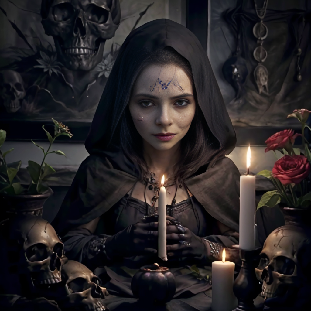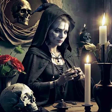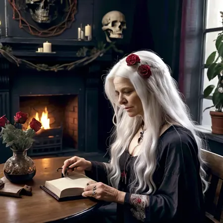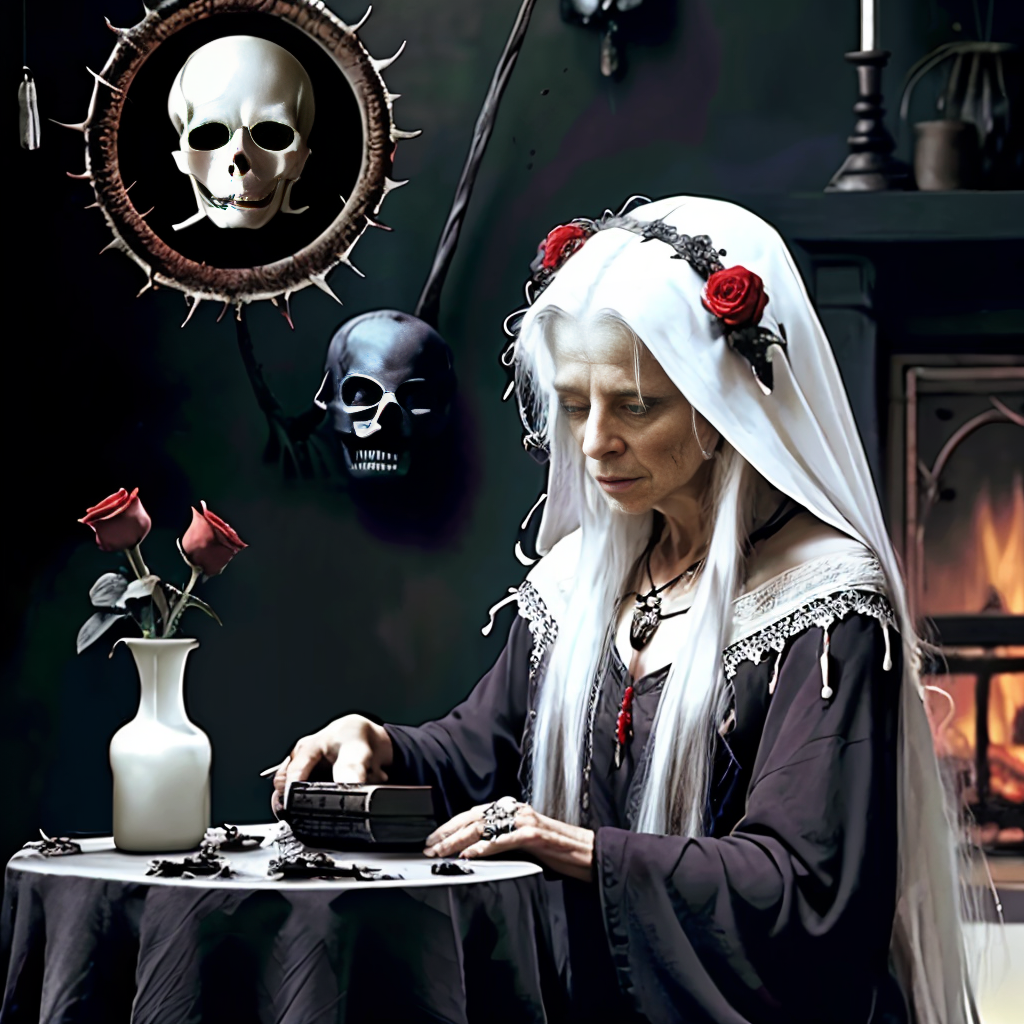 black cloak, black hair, blonde hair, blood, blue eyes, blurry, bone, book, bracelet, candle, candlelight, candlestand, cloak, closed mouth, cup, dark, dress, facial mark, fire, fireplace, flower, food, forehead mark, gloves, hair ornament, holding, holding skull, hood, horns, indoors, jewelry, long hair, looking at viewer, mole, necklace, old, old woman, outdoors, plant, red flower, ring, robe, rose, silk, sitting, skeleton, skull, spider web, sword, table, vase, veil, white hair, witch, wrinkled skin, writing