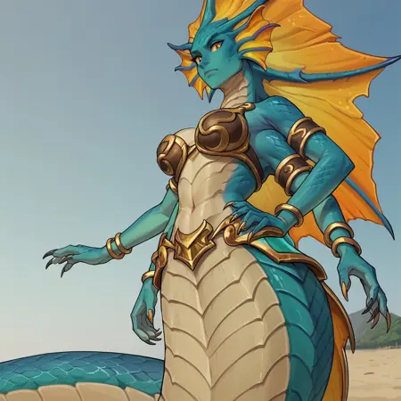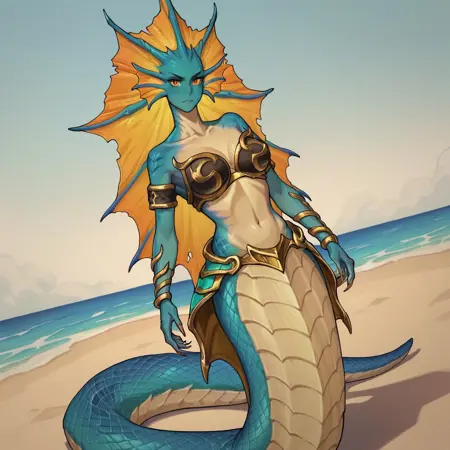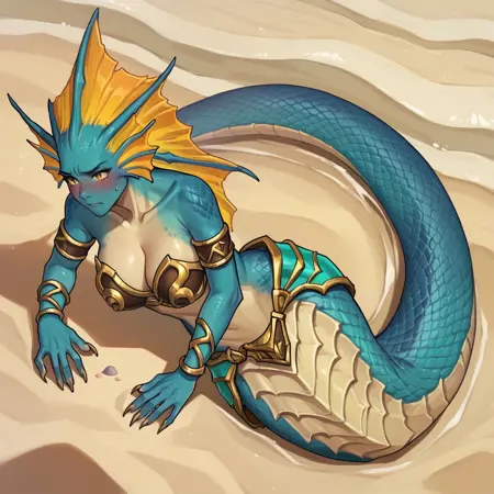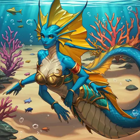 Naga_siren, 여성, 나가, 비늘, 인형, 발톱, 머리 지느러미, 귀 지느러미, 수중, 뱀 꼬리, 파란 피부, 노란 지느러미